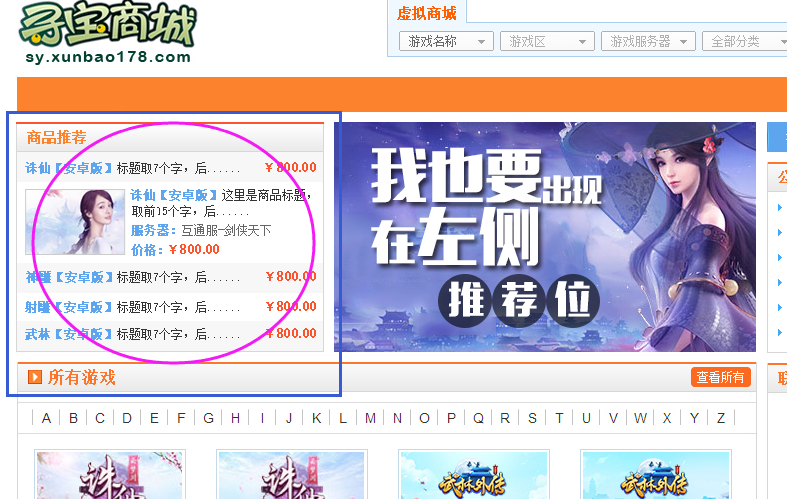 【商品推荐位】寻宝商城手游交易首页展示,游戏商品列表页优先排名展示。更多曝光量,更易售出。