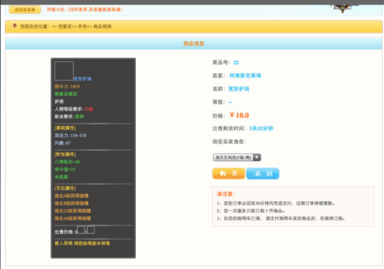 五、选定商品后,点击“购买”按钮,进入装备详细页面。