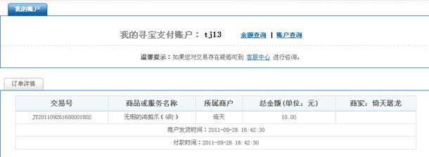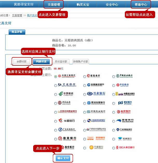 7.系统提供了多种支付方式:寻宝支付余额付款,网银付款,快钱账户付款,支付宝账户付款。每笔交易只能选择其中的一种方式进行支付。若“寻宝支付”账户余额不够支付所需金额,则本次交易只能使用其他付款方式全额付款,或者向“寻宝支付”账户充值后再由“寻宝支付”余额付款