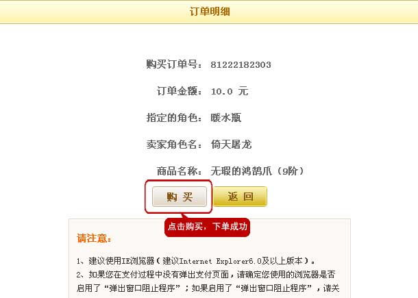 6.在物品详细信息页面点击“购买”,则生成该物品的订单,进入支付页面