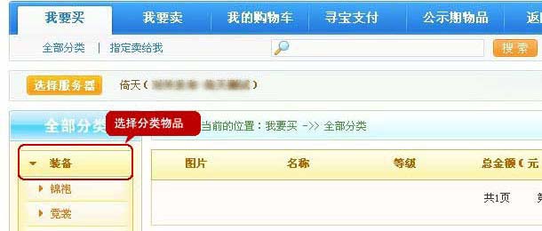 4.玩家登录“寻宝天行”后,即可浏览本服务器在该平台上架在售和公示的商品。系统登录后会默认显示“我要买>>>>全部分类”界面,玩家可以点击左侧的分类浏览当前本服务器正在出售的商品。