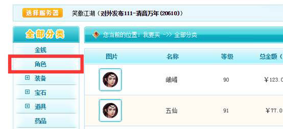 3、选择角色按钮,查看服务器内正在寄售的角色列表。