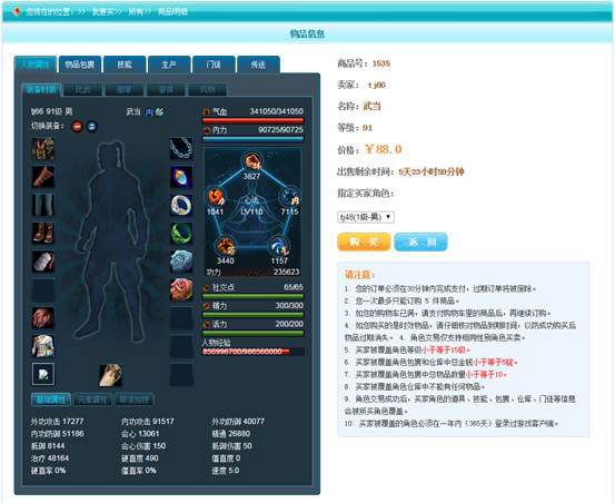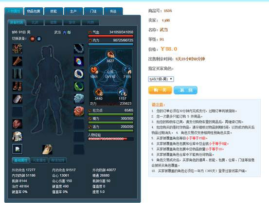 4、点击角色头像,跳转到“商品明细”页,这里展示了该角色的“人物属性”、“物品包裹”、“技能”、“生产”、“门徒”等详细信息,买家可以单击上述任意选项卡查看详细数据,并以此来衡量该商品的价值。