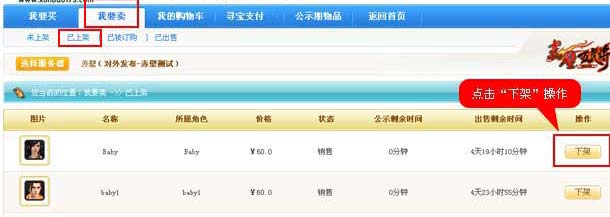 3、使用完美通行证登陆寻宝天行,点击“我要卖”—“已上架”,找到正在寄售中的角色,单击“下架”,确定完成操作。