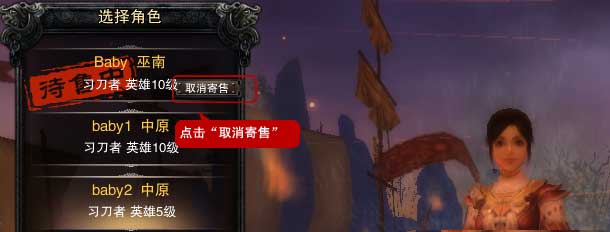 4、登陆《赤壁》客户端,选择正在出售的角色,点击取消寄售,既取消成功。