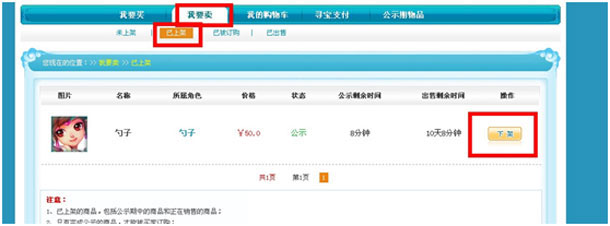 4、 登录后,点击“我要卖”→“已上架”,查找正在寄售中的角色,单击“下架”,点击确定,完成下架操作。