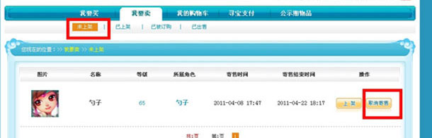 5、 点击“我要卖”中的“未上架”,找到下架物品,单击右侧的“取消寄售”,使角色取消寄售。此时,寄售的该角色已经被成功取消寄售。