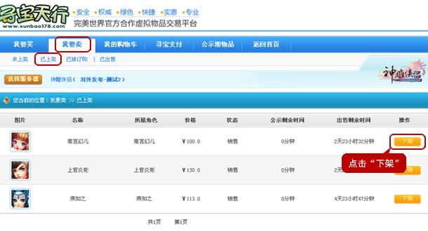 3、点击“我要卖”→“已上架”,找到正在寄售中的角色,点击“下架”,确定完成操作。