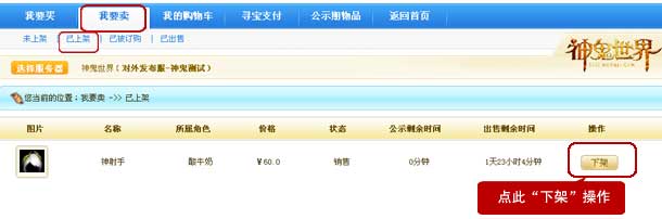 3、使用完美通行证登录寻宝天行,点击“我要卖”→“已上架”,找到正在寄售中的角色,点击“下架”,确定完成操作。