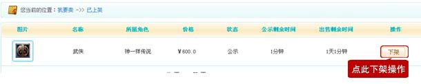 3、使用完美通行证登录寻宝天行,点击“我要卖”→“已上架”,找到正在寄售中的角色,单击“下架”,确定完成操作。