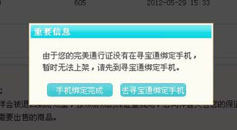 6、未绑定手机的玩家会有提示去寻宝支付绑定手机,点击“去寻宝支付绑定手机”即可去寻宝支付绑定手机,按照寻宝支付提示绑定完手机即可正常上架角色。