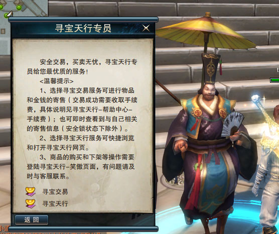 2、游戏中到“洛阳城”找“寻宝天行专员”对话,选择“寻宝交易”。