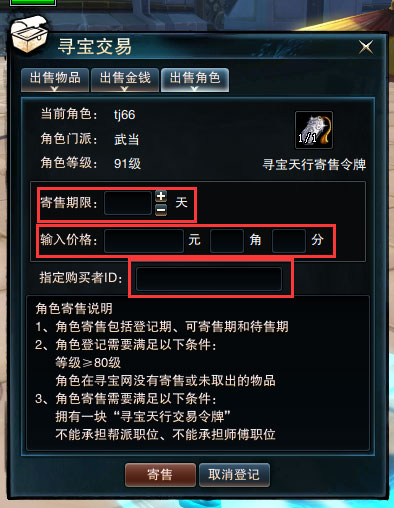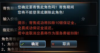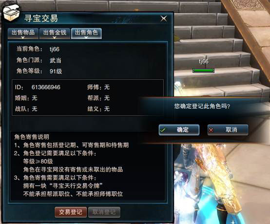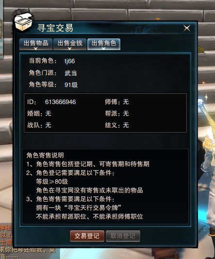 3、“登记出售该角色”为系统检测角色是否满足出售条件,如不满足条件,则给予相应提示。如寄售条件均满足,则角色进入登记状态,角色交易登记期为3天(3×24小时)。在登记期间可以正常进行游戏,每次上线聊天框中都会显示“您的角色正处于交易登记状态。倒计时:xx天xx小时”的提示。登记期间随时可以到“寻宝天行专员”处选择“取消登记该角色”来终止寄售资格。登记期满3天后,在3天有效期内角色上架销售,超过3天需要重新登记角色。未进行登记的角色则无法进行出售,登记角色不扣保证金。