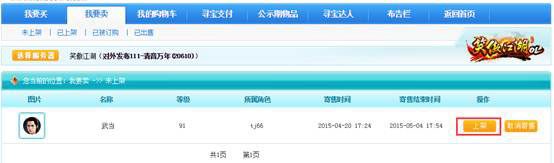 5、寻宝天行为了保护您的帐号安全,在《笑傲江湖》寄售角色时需绑定手机,已绑定手机的玩家可以点击关闭提示按钮,输入价格及出售天数等正常寄售到寻宝天行;没有绑定手机的玩家寄售角色后在寻宝天行是处于未上架状态,无法进入正常交易流程。点击“登录寻宝天行”按钮,打开笑傲江湖站,选择你所在的大区和服务器,在“我要卖-未上架”中找到你的角色,点击“上架”按钮。