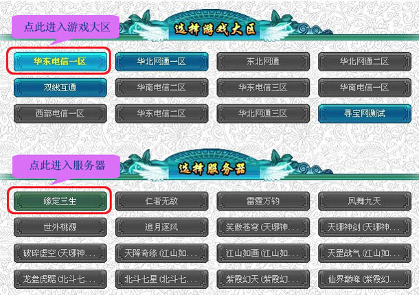 2.选择游戏大区并选择游戏大区下相应的服务器