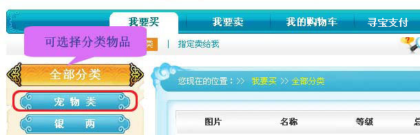4.玩家登录“寻宝天行”后,即可浏览本服务器在该平台上架在售和公示的商品。系统登录后会默认显示“我要买>>>>全部分类”界面,玩家可以点击左侧的分类浏览当前本服务器正在出售的商品;玩家也可以选择“我要买>>>>指定卖给我”的选项来浏览在当前服务器上指定卖给自己的商品。