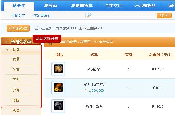 四、登录成功后即可浏览到本服务器在寻宝天行上正在出售的商品。玩家可以点击左侧的分类浏览当前本服务器正在出售的商品;也可以选择“我要买”—“指定卖给我”选项来浏览当前服务器上制定卖给自己的商品。