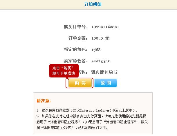 五、选定商品后,点击“购买”按钮,进入装备详细页面。