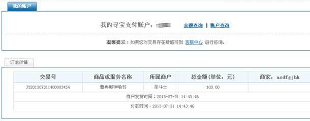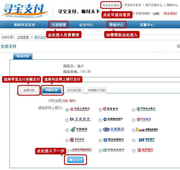 七、系统提供了多种支付方式:寻宝支付付款,快钱账户付款,支付宝账户付款。每笔交易只能选择其中的一种方式进行支付。若“寻宝支付”账户余额不够支付所需金额,则本次交易只能使用其他付款方式全额付款,或者向“寻宝支付”账户充值后再由“寻宝支付”余额付款。