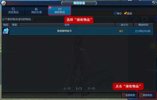 八、买家确认付款,交易成功之后,进入游戏后到圣域神职和生息区找“寻宝大使佩赛芬”或“寻宝大使达芙妮”,接收物品。