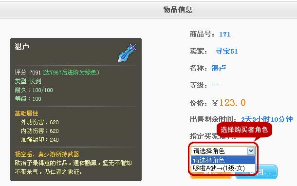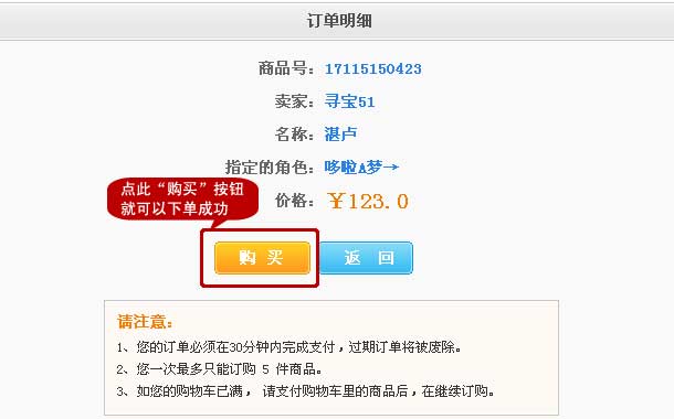 五、选定商品后,点击“购买”按钮,进入装备详细页面。