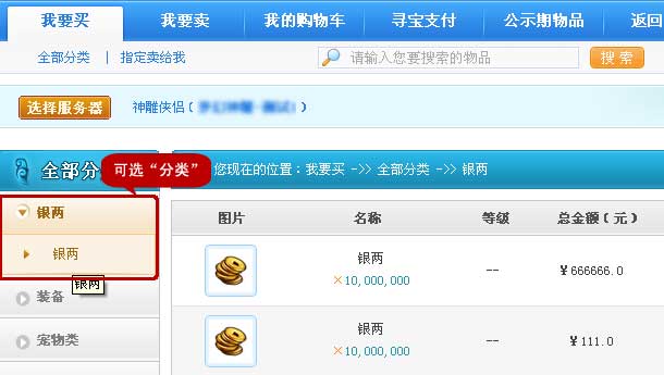 四、登录成功后即可浏览到本服务器在寻宝天行上正在出售的商品。玩家可以点击左侧的分类浏览当前本服务器正在出售的商品;也可以选择“我要买”—“指定卖给我”选项来浏览当前服务器上制定卖给自己的商品。