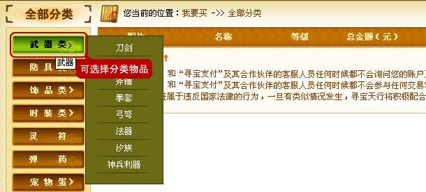 4.玩家登录“寻宝天行”后,即可浏览本服务器在该平台上架在售和公示的商品。系统登录后会默认显示“我要买>>>>全部分类”界面,玩家可以点击左侧的分类浏览当前本服务器正在出售的商品;玩家也可以选择“我要买>>>>指定卖给我”的选项来浏览在当前服务器上指定卖给自己的商品。
