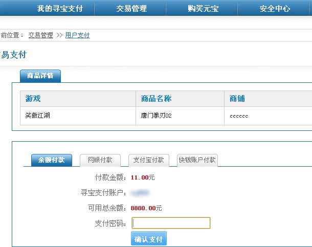 七、系统提供了多种支付方式:寻宝支付 付款,快钱账户付款,支付宝账户付款。每笔交易只能选择其中的一种方式进行支付。若“寻宝支付”账户余额不够支付所需金额,则本次交易只能使用其他付款方式全额付款,或者向“寻宝支付”账户充值后再由“寻宝支付”余额付款。