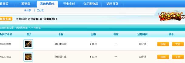 对暂时未进行支付或放入购物车的订单,在订单失效之前,玩家都可以在“我的购物车>>>>未付款”查看并进行支付。