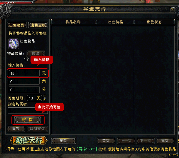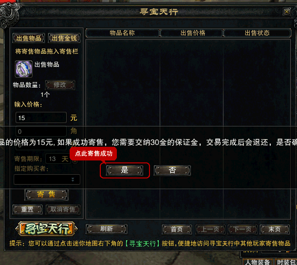 二、首先选择寄售类型,可以对物品、金钱等进行直接寄售,并输入相应的寄售价格、寄售期限、是否指定购买者等。填写完毕,单击“寄售”按钮,确定支付 保证金,开始寄售。