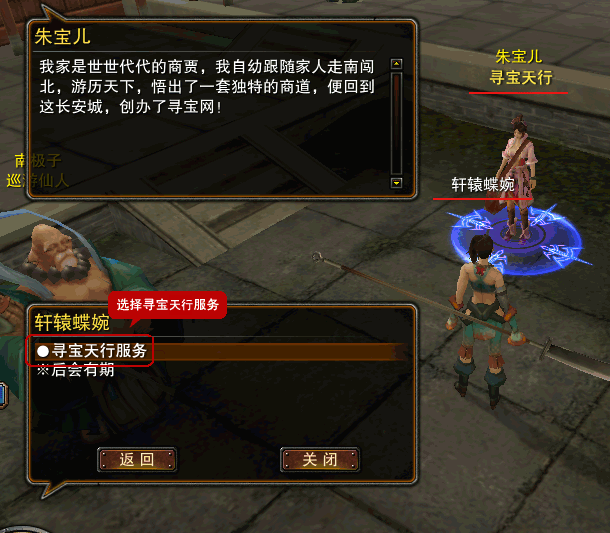 一、在游戏中到“长安”找“朱宝儿”对话,选择“寻宝天行服务”。