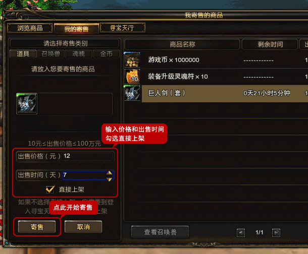 二、选择需要寄售类型后,就可以对道具、召唤兽、魂魄、金币等进行直接寄售,勾选“直接上架”并输入出售价格、出售时间。如果不选择“直接上架”,您需要登录寻宝天行将您的商品手动上架