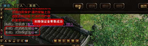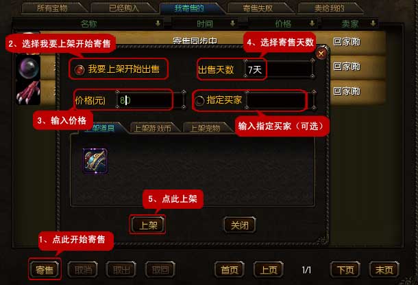 二、点击“寄售”按钮,选择寄售类型后就可以对装备物品、游戏币等进行直接寄售,或者选择“我要上架开始出售”并输入相应的寄售价格、出售天数、指定买家等信息,填写完成后单击“上架”按钮,查看聊天窗口的系统提示信息(注意:交易成功保证金退回)。