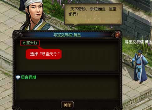 一、在游戏中到“开封”找“寻宝交易使黄金”对话,选择“寻宝天行”。