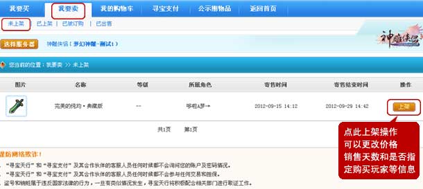 三、用游戏帐号登录寻宝天行,点击导航栏“我要卖”—“未上架”,可以查到在游戏中通过“寻宝天行管理员”寄售的物品。目前处于“未上架”状态的物品,点击“上架”按钮,进行上架操作