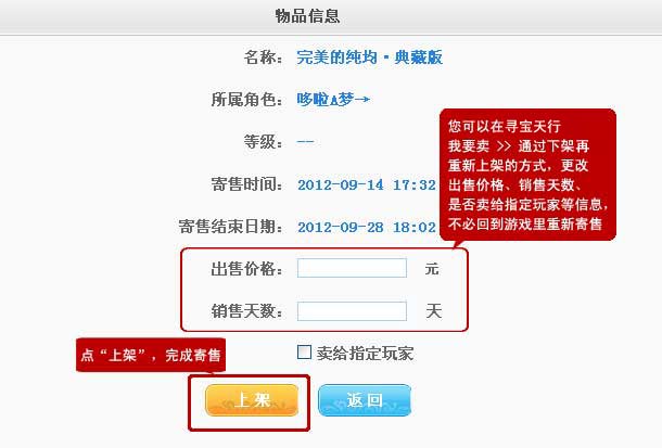 四、点击“上架”后,根据提示输入相应的出售价格、销售天数、是否指定玩家等内容提交。游戏道具和宠物有30分钟到3天的公示期,物品过了公示期之后就可以被其他玩家购买。点击导航栏“我要卖—已上架”,可以查看到交易平台中上架的物品。