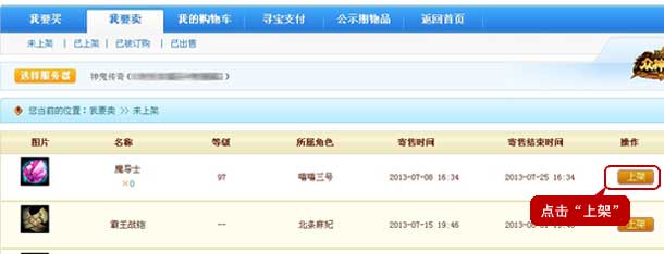 二、点击页面上方导航“我要卖>>未上架”,可以查看到在游戏中通过NPC寄售的物品,目前处于“未上架”状态。点击物品右方“上架”按钮,进行上架操作。