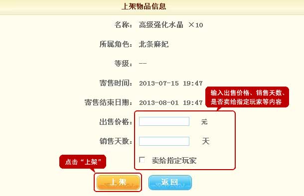 三、点击“上架”后,根据提示输入相应的出售价格、销售天数、是否卖给指定玩家等内容并提交。游戏道具和宠物都有30分钟的公示期,该物品公示期结束后,就可以被其他玩家购买。
