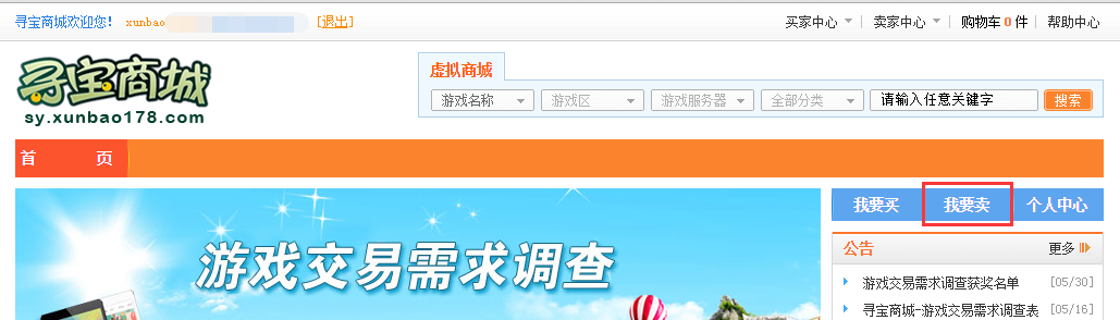 1. 打开寻宝商城(sy.xunbao178.com),选择右上角“我要卖”,进入出售环节
