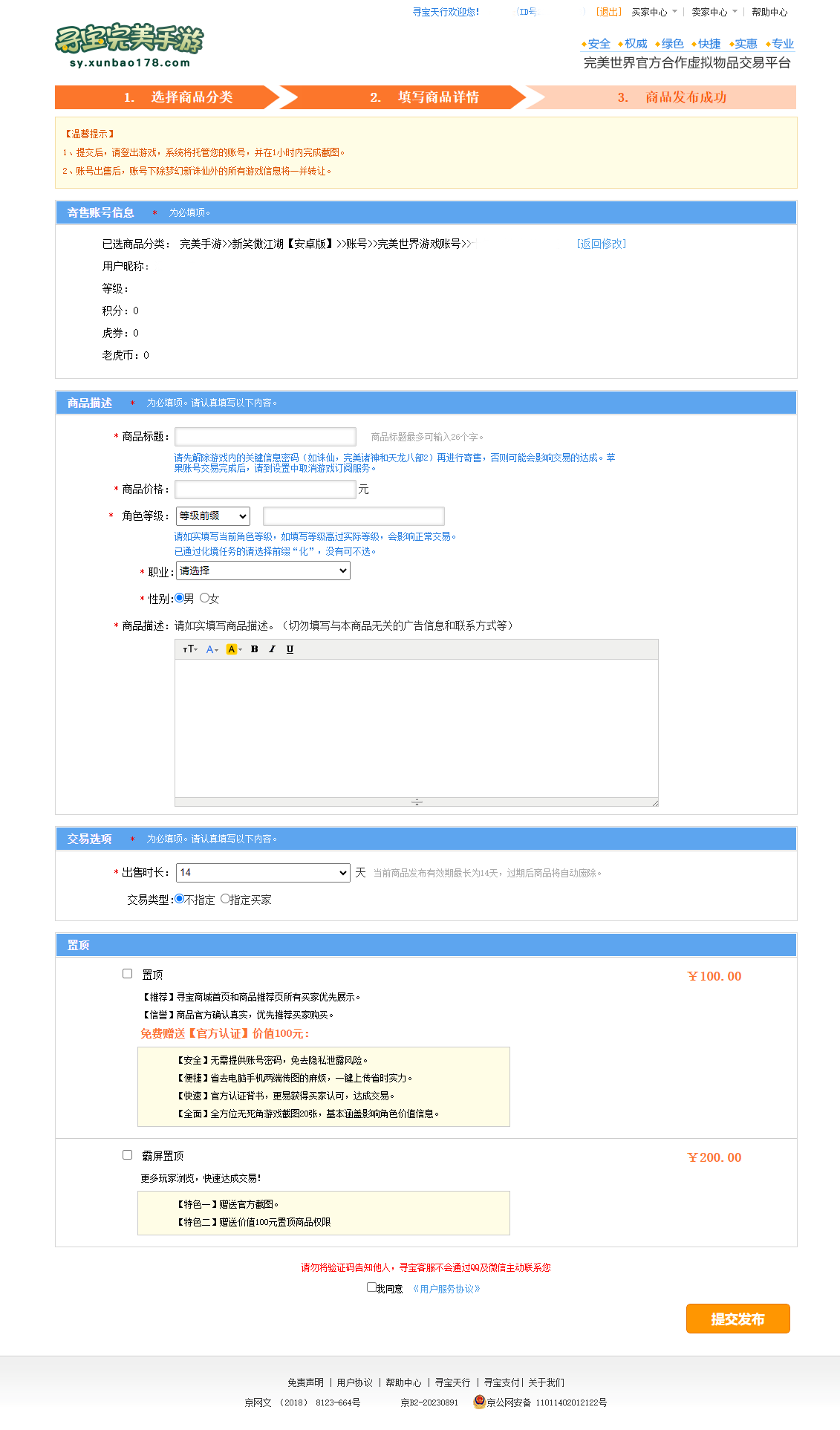6. 在寻宝商城出售完美世界游戏账号需要公示6小时才能进入正常的销售状态。
