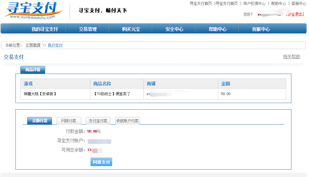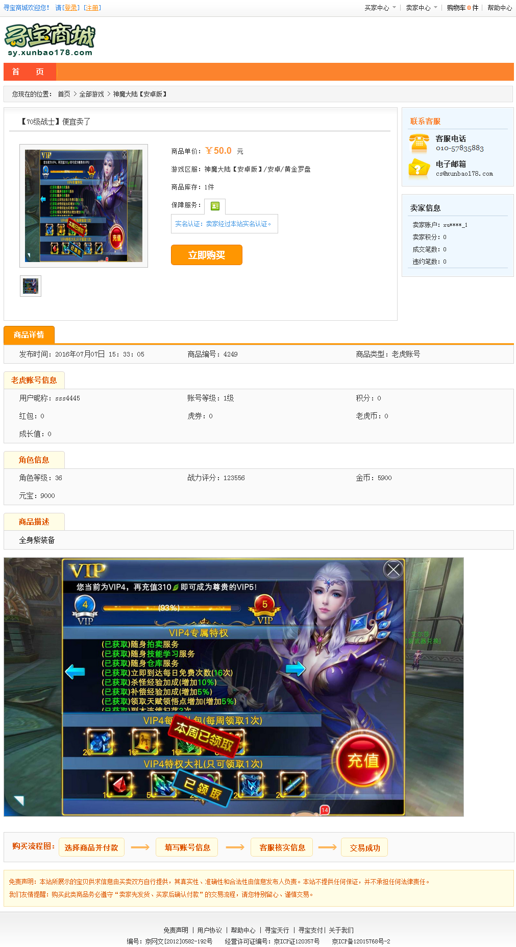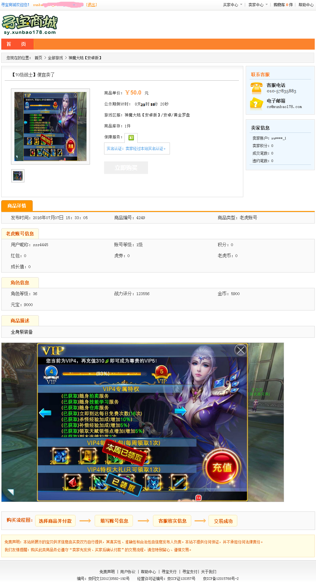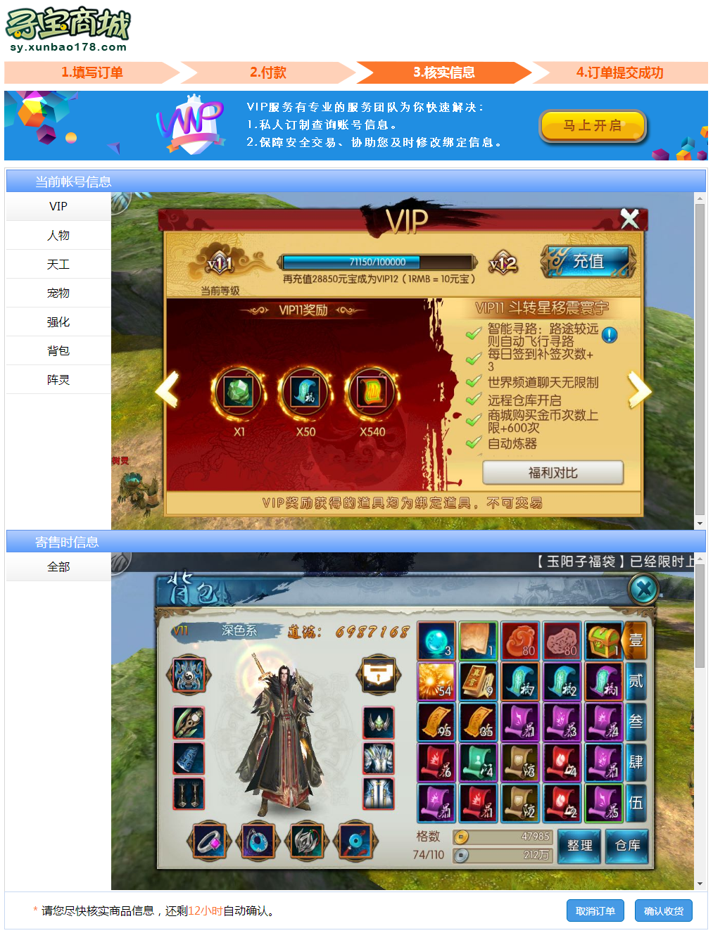 8.核实信息页面,在本页可以详尽的查看账号信息。在本页可以选择【确认收货】【取消交易】【VIP服务】,请尽快核实商品信息,12小时 后不能取消交易。如不小心关闭本页可以在“个人中心-我是买家-已支付订单”中继续操作。