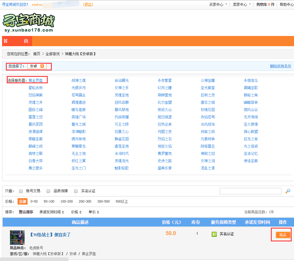 2. 根据需要选择游戏大区和服务器,也可以浏览全区全服的账号出售信息