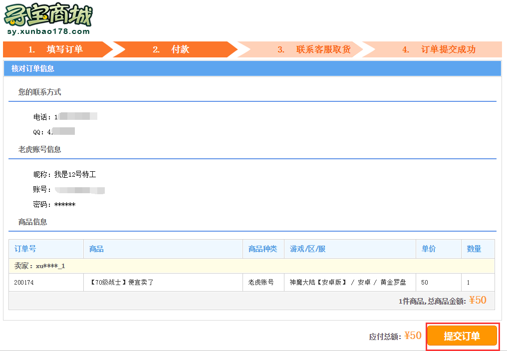 5. 确认订单页面,核实联系方式、完美世界游戏账号信息寄订单金额。