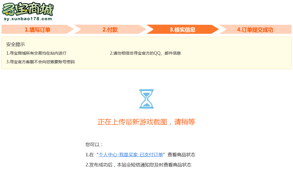 7. 在寻宝支付完成后,进入等待页面传图,约等待5-10分钟即可查看核实信息页面。如关掉本页可以在“个人中心-我是买家--已支付-订单详情”中点击【核实信息】文字链接进入核实信息页面。